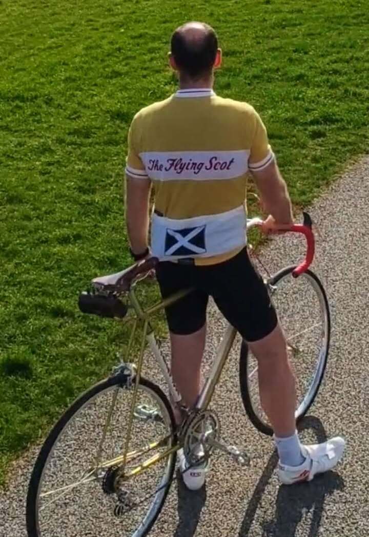 Thomas with his 70-year old Flying Scot and custom jersey to match